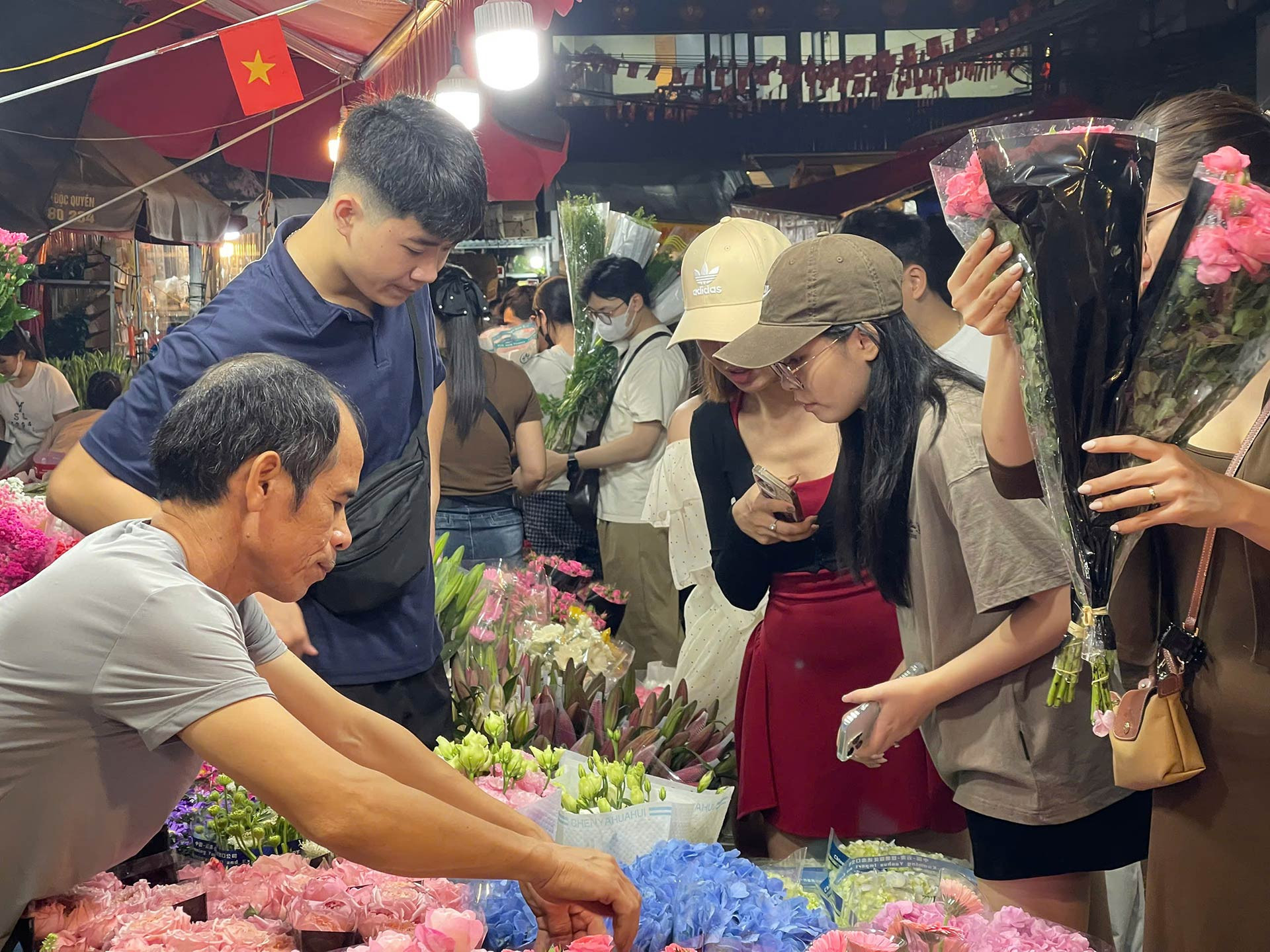Nửa đêm, tại một cửa hàng bán sỉ và lẻ trong chợ, không khí vẫn tấp nập người ra vào. Anh Trí Sơn (khách mua sỉ, quận Hai Bà Trưng) chia sẻ: “Bình thường tôi chỉ nhập hoa 2-3 ngày một lần, nhưng dịp này ngày nào cũng phải đi, mỗi lần nhập số lượng nhiều gấp ba lần ngày thường”.