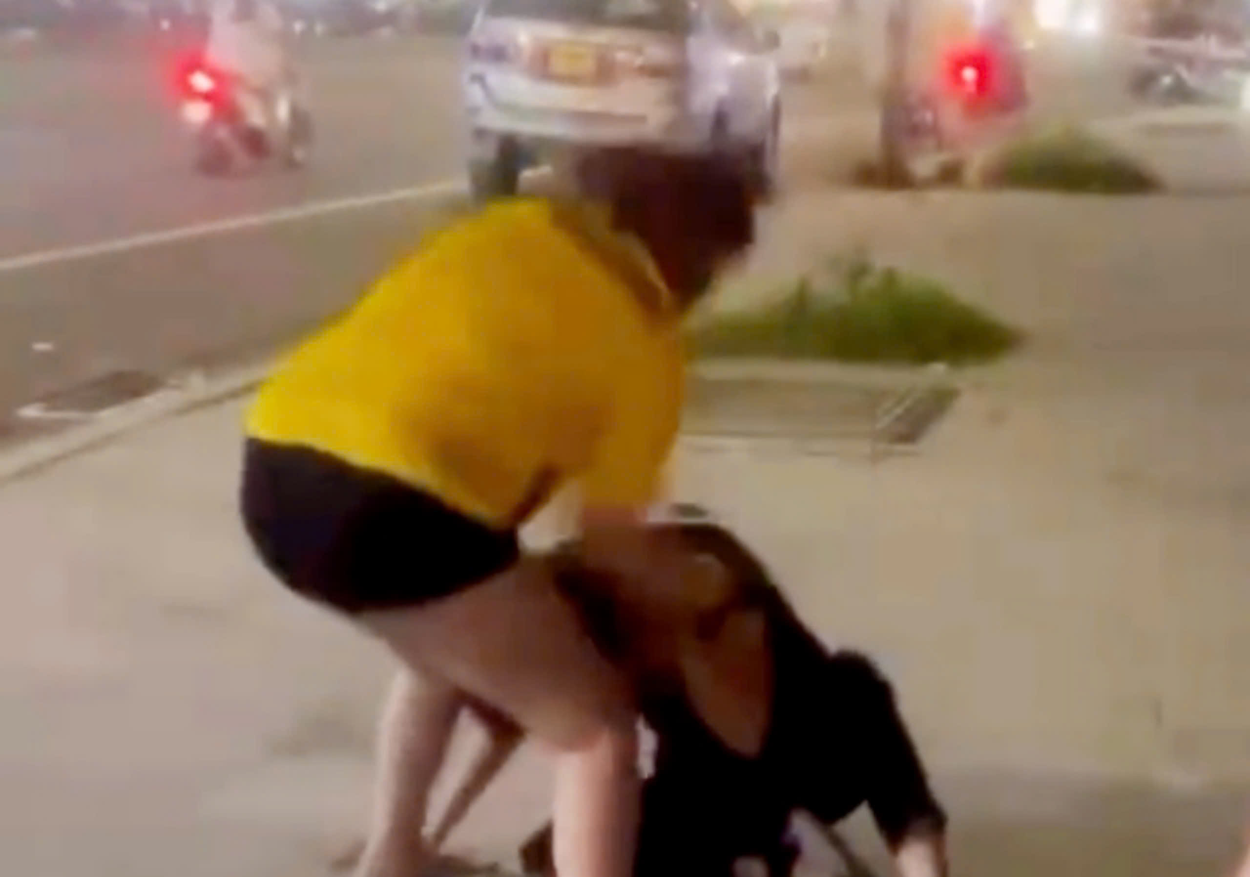 Cảnh báo người phụ nữ mặc áo thun vàng đánh người phụ nữ áo đen trên đường phố ở Phú Quốc – Ảnh: cắt lại clip