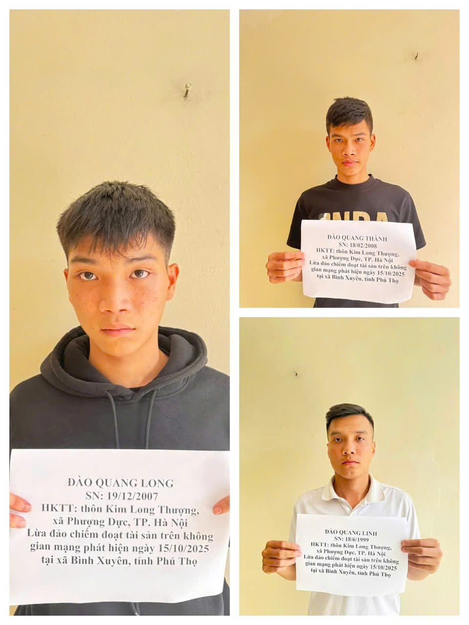 🛑Ngày 16/12/2025, Cơ quan Cảnh sát điều tra, Công an tỉnh Phú Thọ đã ra Quyết định khởi tố vụ án, khởi tố bị can và áp dụng biện pháp ngăn chặn cấm đi khỏi nơi cư trú đối với 3 đối tượng gồm: Đào Quang Linh, sinh năm 1999; Đào Quang Thành, sinh năm 2008 (em trai ruột của Linh) và Đào Quang Long, sinh năm 2007(em họ của Thành, Linh) cùng trú tại thôn Kim Long Phượng, xã Phượng Dực, thành phố Hà Nội về tội Lừa đảo chiếm đoạt tài sản, quy định tại khoản 1 Điều 174 Bộ luật Hình sự.