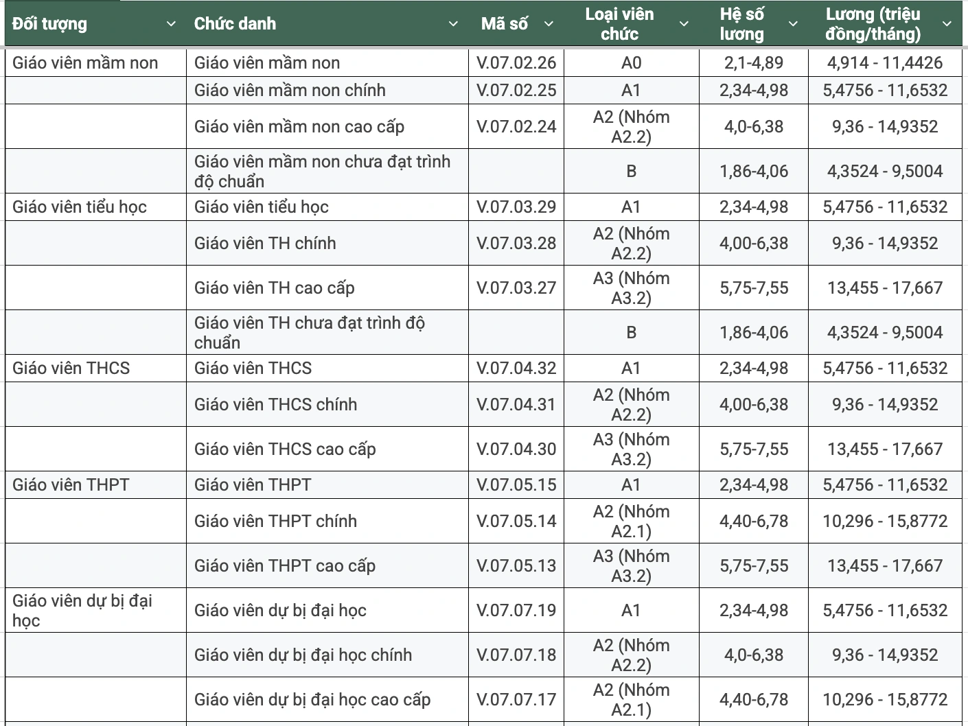 Giáo viên Tiểu học/THCS/THPT cao cấp | A3 | 5,75-7,55 | 13,45-17,66 |
